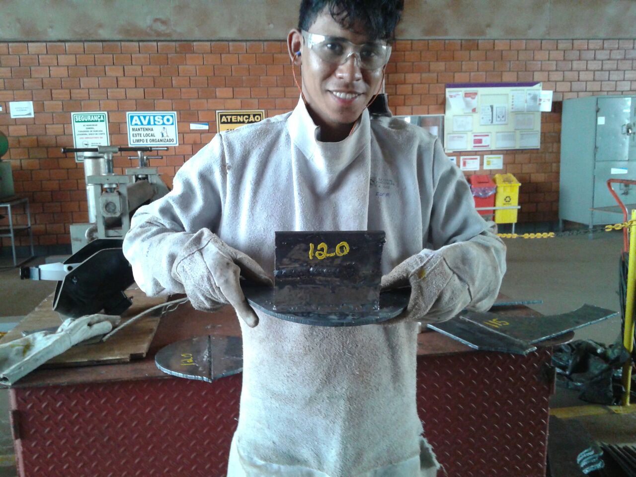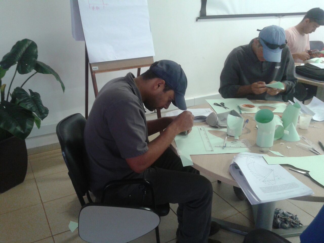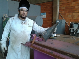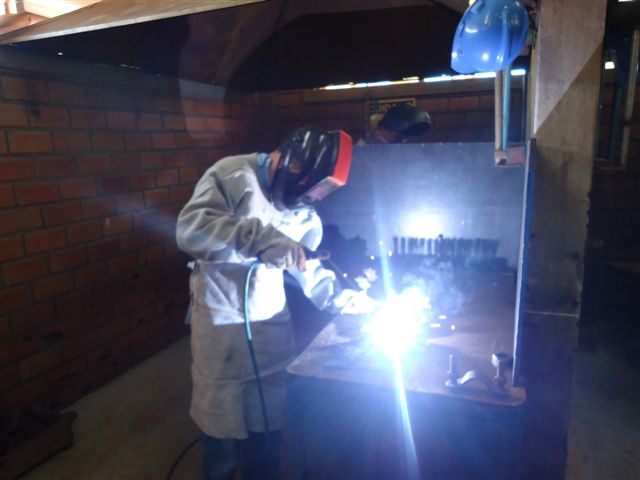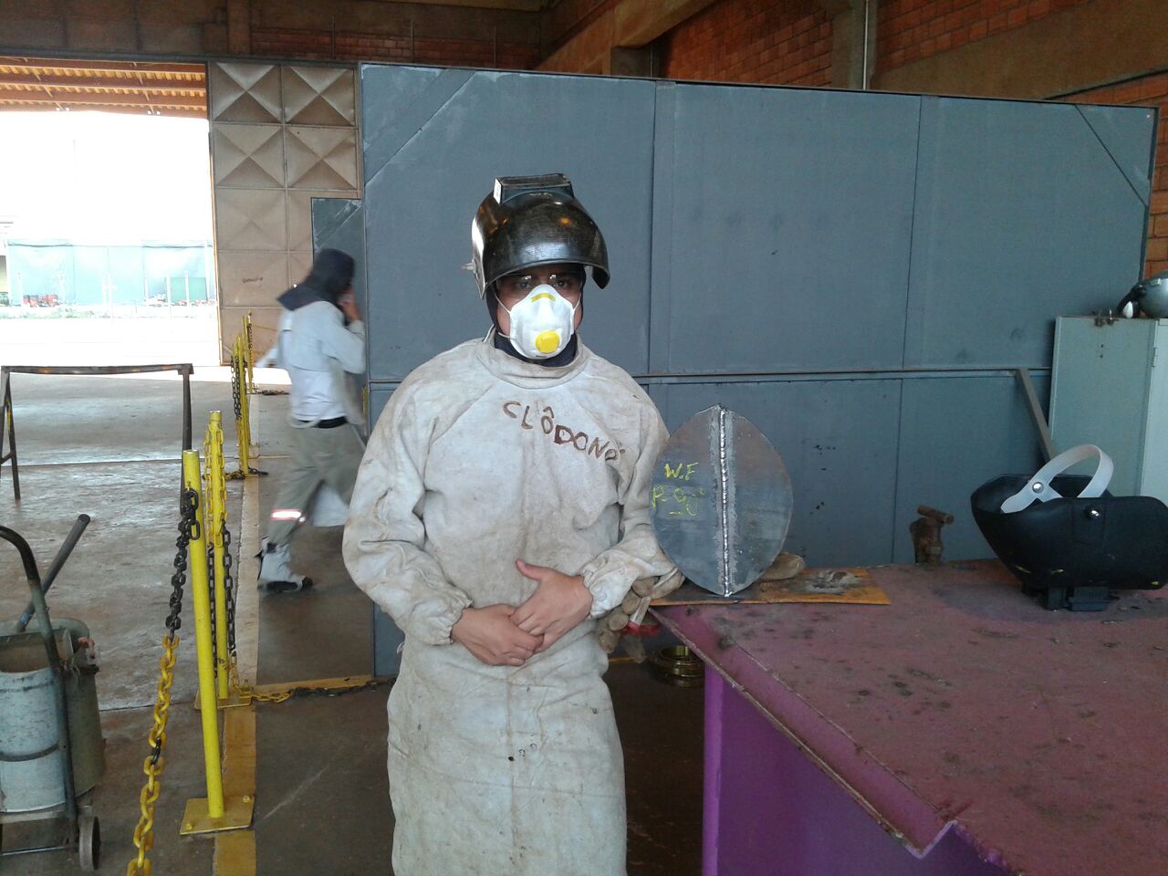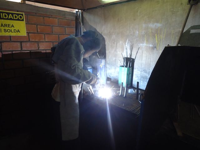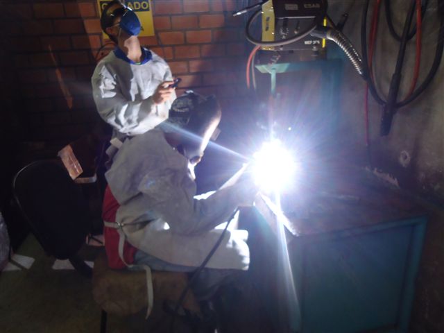 Fotos de turmas de Soldagem e Caldeiraria (aulas teórico/práticas), em sala de aula e no campo. Os alunos efetivamente realizam as práticas primeiramente em cartolina (sala de aula) e após as aulas no campo, em chapa de aço carbono, utilizando as técnicas aprendidas na teoria.